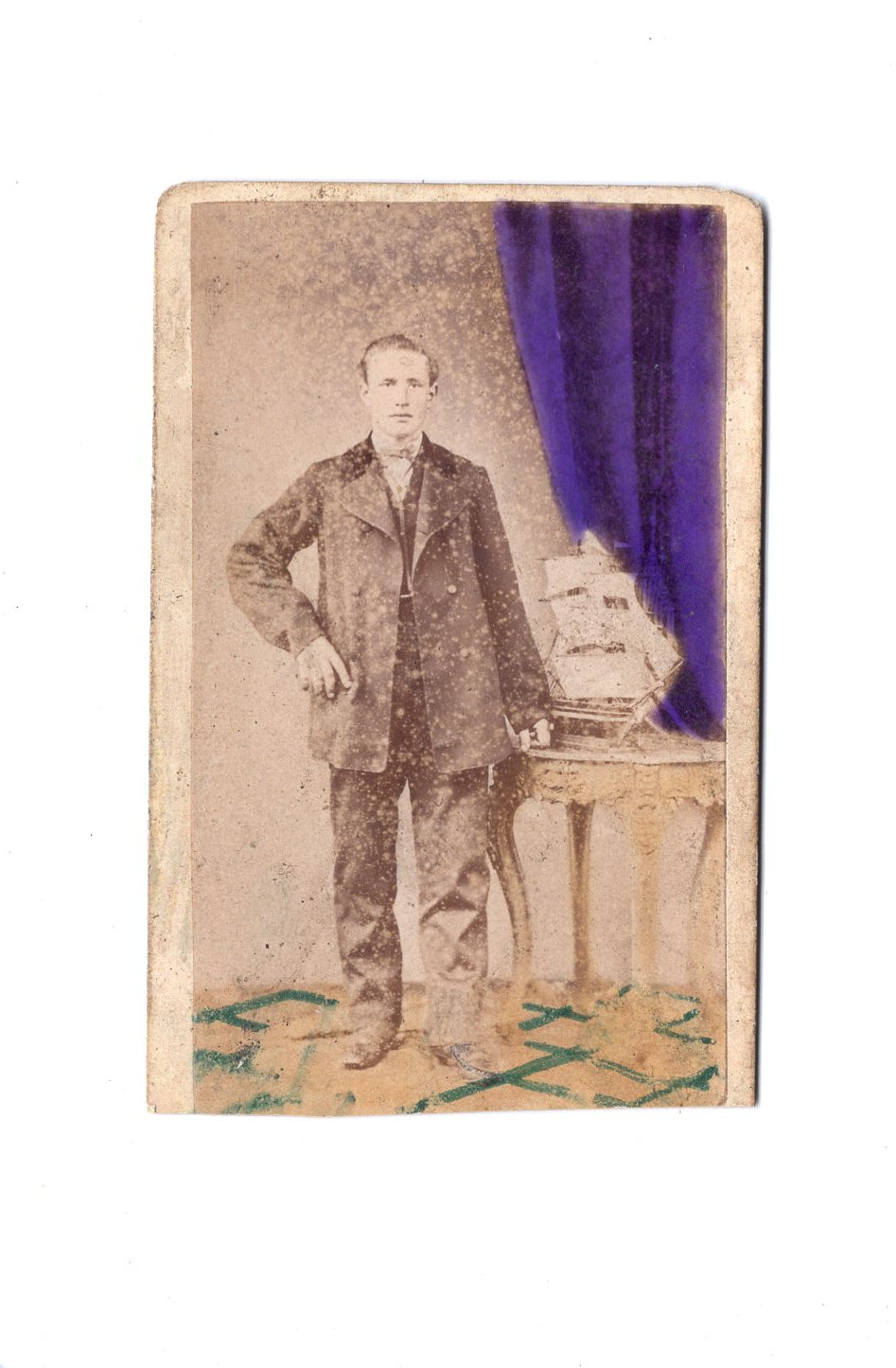 Fotografie Feiner Herr mit Modellschiff - Hamburg St. Pauli um 1870