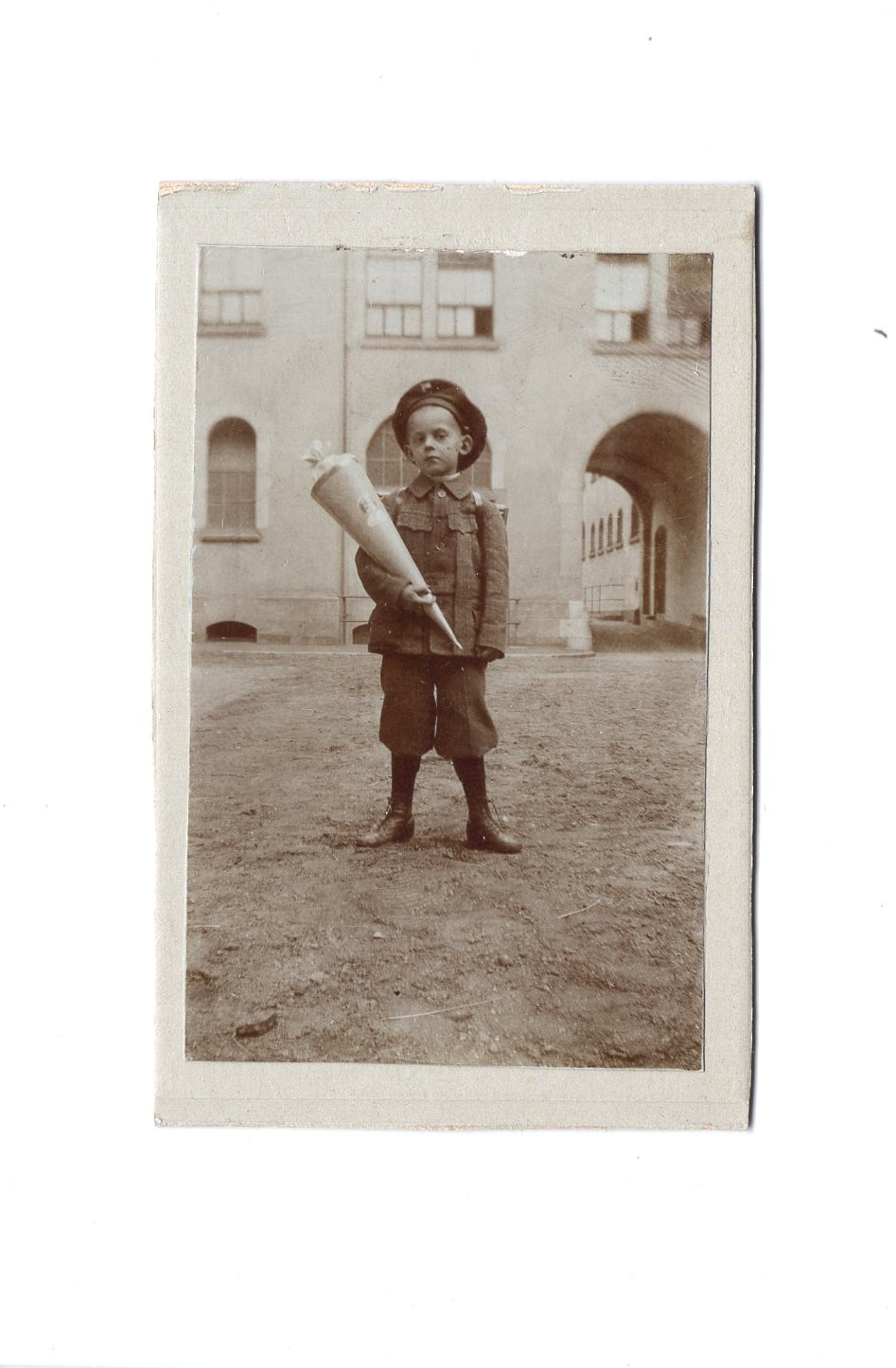 Fotografie Niedlicher kleiner Junge mit Schultüte - unbekannter Ort um 1920